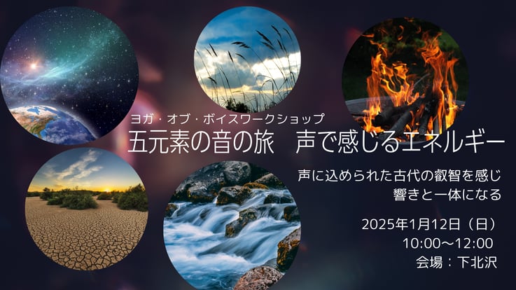 五元素(地・水・火・風・空)それぞれの音を声にし、その響きを全身で感じていきます。